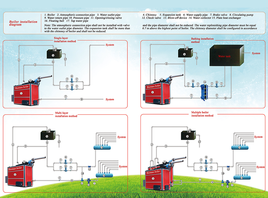 4. A safety device is installed to prevent tempering, low water level, overheating and anti-freezing, etc. and can alarm automatically in the event of abnormality;